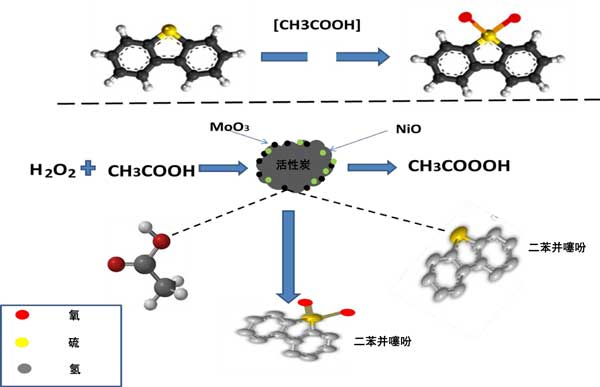 ¡¡¡¡Í¼3£ºNiO-MoO3»îÐÔÌ¿´ß»¯¼Á´æÔÚÏÂH2O2/CH3COOHÑõ»¯Ìåϵ¶Ô¶þ±½²¢àç·ÔµÄÑõ»¯ÍÑÁò»úÀí¡£