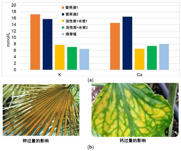 ¡¡¡¡Í¼2£º(a)ͨ¹ý»îÐÔÌ¿ºÍˮ̿´¦Àí½«½Ï¸ßŨ¶ÈµÄCaºÍK½µµÍµ½°²È«µÄ¿É»ØÊÕˮƽ¡£(b)¹ýÁ¿µÄ¼ØºÍ¸Æ¶ÔÖ²ÎïÉú³¤µÄÓ°Ïì¡£