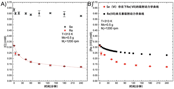 比较了Se(VI)+Re(VII)体系和单独Re(VII)体系的吸附动力学曲线和吸附容量。得到的结果如图1A和B所示,清楚地显示了动力学曲线和吸附容量的差异。如图1B所示,Re(VII)和Se(VI)的混合物对Re(VI)的吸附远高于Se(VI),表明对Re(VII)的选择性。处理240分钟后,铼离子浓度从0.3mM下降到0.11mM,这意味着>60%的铼离子被吸附。然而,在硒吸附的情况下,如图1所示A,Se(VI)的初始浓度(0.63mM)和最终浓度(0.59mM)之间的差异等于0.06%(图1A)。该值在测量误差范围内,可以忽略不计。在这个过程中已经证实了活性炭对Re(VII)的选择性。根据获得的结果,确定将仅针对Re离子进行进一步的研究工作。