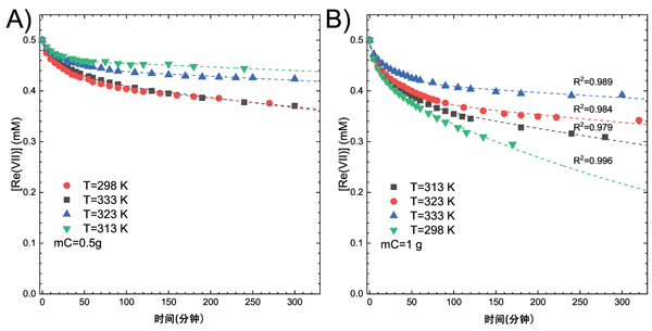 图2显示了溶液Re(VII)的初始浓度=0.5mM在不同温度和活性炭量下的动力学曲线。图2A和B显示了当每200cm3溶液分别使用0.5和1g活性炭时的浓度变化。溶液中使用的活性炭量越大,Re(VII)浓度的降低越显着。这种趋势归因于吸附剂的大比表面积,这导致了大容量。碳含量加倍使表面积加倍。
