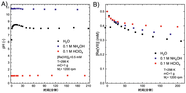 在不同溶液中解吸的动力学曲线。在过程的初始阶段解吸率最高。当大约91%的金属解吸到0.1M/HClO4中时,计算最终浓度。在这种情况下,铼化合物的再溶解与解吸一起发生。水的特点是解吸率最低;只有15%的Re被解吸。在0.1M/NH4OH的情况下,3小时后的最终浓度为0.093mM,38%的Re被解吸。然而,0.1M/NH4中的铼浓度OH在解吸的第一个小时内增加,之后略有下降。