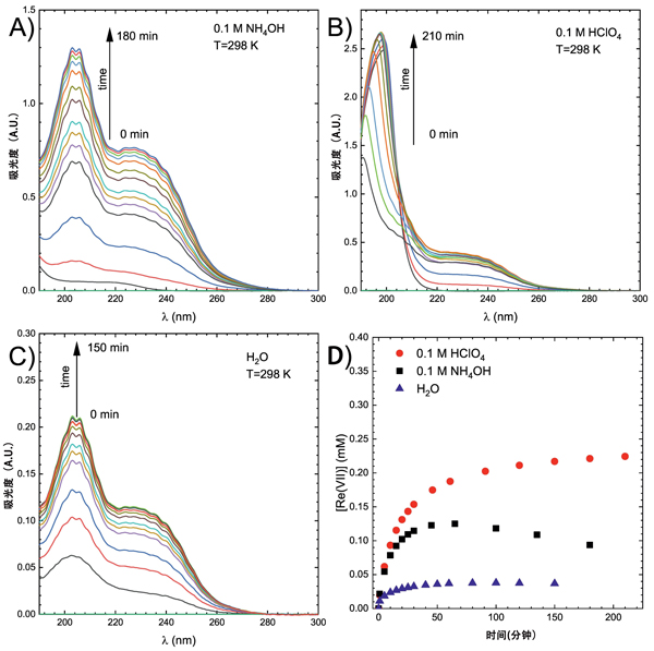 对于解吸研究,在25℃吸附后,200cm3溶液使用1g活性炭。Re(VII)离子的初始浓度为0.5mM。吸附后,将样品分成三部分。然后在三种环境中进行解吸,即0.1M/HClO4、0.1M/NH4OH和H2O。在所有情况下,每50cm3液体使用0.3g活性炭。UV-Vis光谱和动力学曲线如图4。