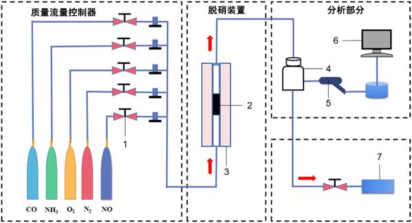¡¡¡¡Í¼2£ºÆøÌ巴ӦװÖÃʾÒâͼ(1)ת×ÓÁ÷Á¿¼Æ£¬(2)´ß»¯¼Á£¬(3)¹Ì¶¨´²·´Ó¦Æ÷£¬(4)»º³åÆøÆ¿£¬(5)̽²âǹ£¬(6)ÑÌÆø·ÖÎöÒÇ£¬(7)·ÏÆø»ØÊÕ×°Öá£