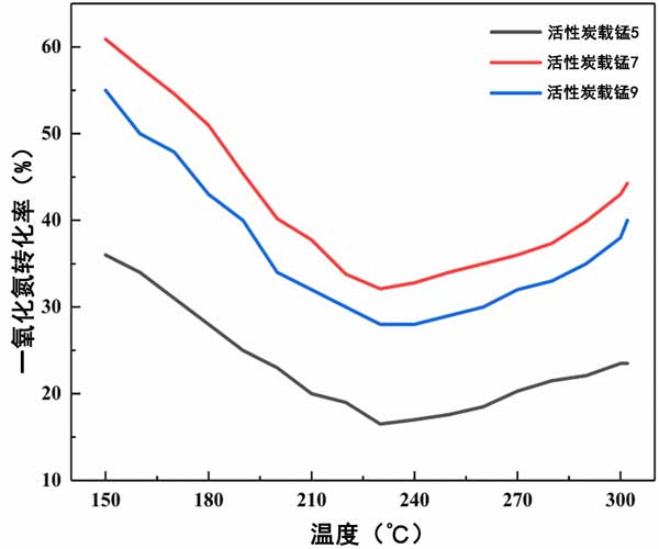 ¡¡¡¡Í¼3£º»îÐÔÌ¿ÔØÃÌ´ß»¯¼ÁµÄNOת»¯ÂÊ¡£