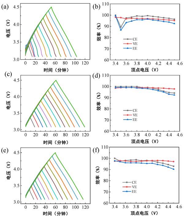 ¡¡¡¡¿ÉÒÔ²ÉÓÃÄÜЧ±ä»¯×÷ΪһÖÖÓÐÓõŤ¾ßÀ´È·¶¨½»Á÷µç¼«ÔÚË®ÐÔ»ò·ÇË®ÐÔµç½âÖÊÖеÄÎȶ¨µçÊÆÉÏÏÞºÍÏÂÏÞ¡£¸ù¾Ý»îÐÔÌ¿°ëµç³ØµÄºãµçÁ÷³ä·ÅµçÇúÏߣ¬EE¶¨ÒåΪ·ÅµçÄÜÁ¿Óë³äµçÄÜÁ¿Ö®±È£¬¿¼ÂÇÁ˳ä·Åµç¹ý³ÌÖÐÈÝÁ¿ËðʧºÍµçѹ½µµÄÓ°Ïì¹ý³Ì¡£´ËÍ⣬¿âÂØÐ§ÂÊ(CE)±»³ÆÎª·ÅµçÈÝÁ¿Óë³äµçÈÝÁ¿Ö®±È£¬µçѹЧÂÊ(VE)±»³ÆÎª»îÐÔÌ¿µÄ·Åµçƽ̨µçѹÓë³äµçƽ̨µçѹ֮¼äµÄ±ÈÂÊ¡£µ±½»Á÷µç¼«Éϵĵ缫/µç½âÖʽçÃæ·¢Éú΢ÃîµÄÑõ»¯»¹Ô·´Ó¦(µçºÉ×ªÒÆ·´Ó¦)ʱ£¬µç½âÖʷֽⷴӦ»áµ¼Ö²»ÈÜÐÔ²úÎïµÄ³Á»ýºÍ¶Û»¯Ä¤(Òõ¼«µç½âÖʽçÃæ)ÔÚ½»Á÷µç¼«µÄ±íÃæ»ò¿É½Ó´¥µÄ¿×϶ÖС£ÔÚÕâÀÓÉÓÚVEºÍCEµÄÀÛ»ýЧӦ£¬EE±ÈCE¶Ô²»¿ÉÄæÑõ»¯»¹Ô·´Ó¦¸üÃô¸Ð¡£Òò´Ë£¬EEµÄͻȻϽµ¿ÉÒÔ×÷ΪÅжϽ»Á÷µç¼«Îȶ¨µçλÉÏÏÞµÄÒÀ¾Ý¡£CEºÍVEµÄ±ä»¯Ç÷ÊÆ¿ÉÒÔ×÷Ϊ²Î¿¼¡£¾ßÓв»Í¬ï®Àë×Óµç½âÖʵĻîÐÔ̿ﮰëµç³Ø´ÓÁãµçºÉµçλºãµçÁ÷³äµçºÍ·ÅµçÖÁ2mAµÄ¸÷ÖÖ½ØÖ¹µçѹ¡£¶¥µãµçѹ´Ó3.4VÔö¼Óµ½4.5V£¬²½³¤Îª0.1V£¬Èçͼ1aËùʾ¡£EE¡¢CEºÍVEÖµ×÷Ϊ¶¥µãµçѹµÄº¯ÊýÈçͼ1bËùʾ¡£¸ù¾ÝEE×¼ÔòÈ·¶¨½ØÖ¹µçѹ£¬¿ÉÈ·¶¨½»Á÷µç¼«ÔÚEDD¡¢EPDºÍPCEµç½âÒºÖеÄÎȶ¨µçλÉÏÏÞ·Ö±ðΪ4.0V¡¢4.0VºÍ4.1V£¬·ûºÏÎÒÃÇ֮ǰµÄʵÑé½á¹û¡£