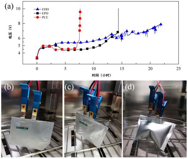 ¡¡¡¡Í¼2£º¹ý³äÖÁ10.0VµÄ»îÐÔ̿ﮰëµç³Ø£º(a)µçÑ¹ËæÊ±¼ä±ä»¯ÇúÏߣ¬ÒÔ¼°Ê¹Óò»Í¬µç½âÖʹý³ä¹ý³Ìºó°ëµç³ØµÄÕÕÆ¬£º(b)EPD£¬(c)PCEºÍ(d)EDD¡£