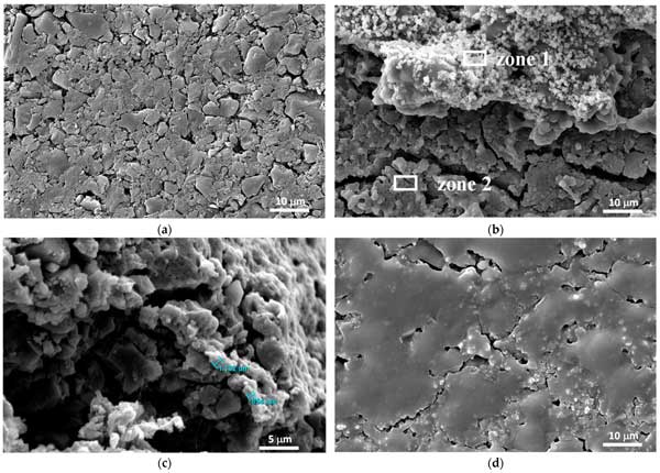 ¡¡¡¡Í¼3£º(a)½»Á÷µç¼«ºÍÀ´×Ô»îÐÔ̿ﮰëµç³ØµÄ½»Á÷µç¼«µÄSEMͼÏñ³äµçµ½10.0VµÄ¸ßµçѹ£¬¾ßÓв»Í¬µÄµç½âÖÊ(b¡¢c)PCE£¬(d)EPD¡£