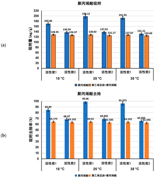 ¡¡¡¡Í¼1£º¾Û±ûÏ©ËáÎü¸½Á¿(a)¼°Æä´Ó»îÐÔÌ¿±íÃæÈ¥³ýµÄ°Ù·Ö±È(b)ÔÚµ¥Ò»ºÍ»ìºÏÎü¸½ÎïϵͳÖУ¬ÔÚÈý¸ö¼ì²âζÈpHÖµ3Ï¡£