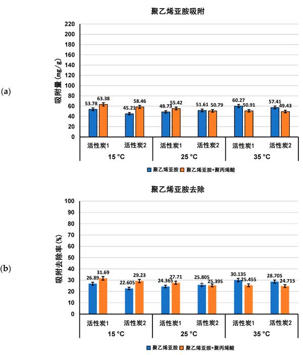 ¡¡¡¡Í¼2£º¾ÛÒÒÏ©Ñǰ·Îü¸½Á¿(a)¼°Æä´Ó»îÐÔÌ¿±íÃæÈ¥³ýµÄ°Ù·Ö±È(b)ÔÚµ¥Ò»ºÍ»ìºÏÎü¸½ÎïϵͳÖУ¬ÔÚÈý¸ö¼ì²âζÈpH3Ï¡£