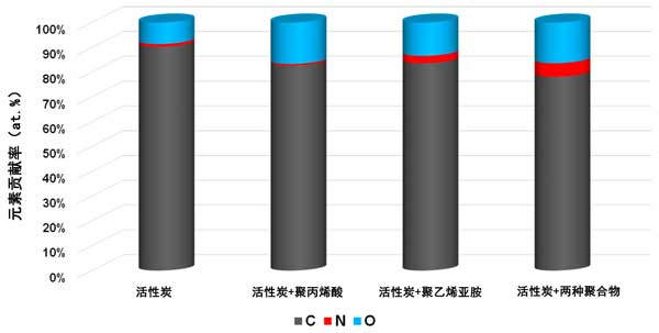 ¡¡¡¡Í¼3£ºÔÚ25¡æÏÂÎü¸½¾ÛºÏÎï֮ǰºÍÖ®ºó»îÐÔÌ¿±íÃæµÄÔªËØ×é³É¡£