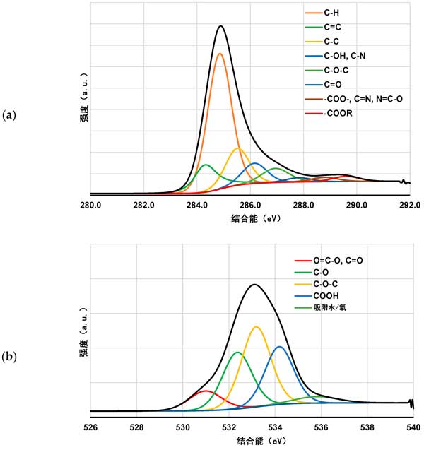 ¡¡¡¡Í¼4£º¾ÛºÏÎïÎü¸½Ç°»îÐÔÌ¿µÄC1s(a)ºÍO1s(b)¹âÆ×¡£