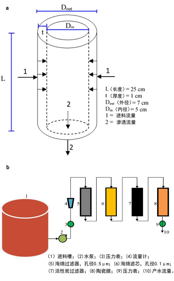 ¡¡¡¡Í¼2£º(a)ÌÕ´ÉĤµÄʾÒâͼ,(b)Ë®´¦Àí¹¤ÒÕÁ÷³ÌʾÒâͼ¡£