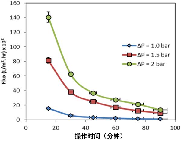 ¡¡¡¡Í¼3ÏÔʾ£¬ÔÚÔËÐÐ90·ÖÖÓºó£¬ÔÚ2barµÄÔËÐÐѹ²îÏ£¬´ïµ½µÄ×î¸ßͨÁ¿Öµ¡£»ùÓÚÕâЩֵ£¬ÒÑÖªÉøÍ¸Í¨Á¿Öµ½µµÍ¡£·¢ÉúÕâÖÖÇé¿öÊÇÓÉÓÚĤ±ÚÉϲ»ÐèÒªµÄÈܽâÎÛȾÎï¿ÅÁ£¶ÂÈû£¬ÕâЩ¿ÅÁ£´óÓÚĤ¿×¡£ÕâЩ¿ÅÁ£¶ÂÈûĤ±íÃæµÄ¿×»ò¿¨ÔÚ¿×ÄÚ¡£ÕâÖÖĤ±Ú¶ÂÈûÓëŨ²î¼«»¯ÏÖÏóÃÜÇÐÏà¹Ø£¬ÔÚÕâÖÖÏÖÏóÖУ¬Ä¤±Ú±íÃæµÄÎÛȾÎïŨ¶È½Ï¸ß£¬µ¼Ö½ϵ͵ÄÁ÷ÌåÁ÷Á¿£¬¶øÍ¨¹ýĤµÄÎÛȾÎï×îÉÙ¡£Ò²¿ÉÒÔÔÚͼ3Öп´µ½ÉøÍ¸Í¨Á¿Ëæ×ŽϸߵIJÙ×÷ѹÁ¦¶øÔö¼Ó£¬Õâ¶ÔÓ¦ÓÚĤ²Ù×÷µÄÇý¶¯Á¦¡£Ê©¼Óµ½Á÷¹ýĤµÄ½øÁÏÁ÷µÄѹÁ¦½«µ¼ÖÂÓëĤ¿×Ïà±È¿ÅÁ£³ß´ç¸üСµÄÁ÷ÌåÁ÷¿ÉÒÔͨ¹ýĤ£¬¶ø½Ï´óµÄ¿ÅÁ££¬ÀýÈçÎÛȾÎ½«±»±£Áô¡£Fe¡¢Mn¡¢Zn¡¢NH3–N¡¢PO4¸÷ÎÛȾÎï´Ó³õʼŨ¶È1.38¡¢1.30¡¢0.92¡¢0.90¡¢0.93mg/LµÄ×ܽØÁôÂÊ·ÖÎö½á¹û·Ö±ðΪ92.03¡¢97.08¡¢99.67¡¢84.56¡¢87.10%¡£ÕâЩ·ÖÎö½á¹ûÏÔʾÁËÕâÏ×÷µÄ¿Éϲ³É¹û£¬ÆäÖÐÿÏî×ܾܾøÂʶ¼ÔÚ80%ÒÔÉÏ¡£