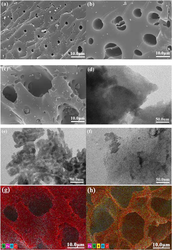 ¡¡¡¡Í¼1£ºÊ¹ÓÃSEMºÍTEM(a,d)ȥľÖÊ»îÐÔÌ¿(b,e)´ÅÐÔ»îÐÔÌ¿(c,f)ȥľÖÊ̿ͼÏñ;ÔªËØ(C¡¢O¡¢N¡¢Fe¡¢S)µÄÓ³Éä·ÖÎö£º´ÅÐÔ»îÐÔÌ¿(g)ºÍ»Ç°·à×à¤Îü¸½µÄ´ÅÐÔ»îÐÔÌ¿(h)¡£