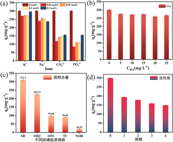 ¡¡¡¡Í¼2£º(a)¸¯Ö³ËáºÍ(b)¹²´æÀë×Ó¶Ô´ÅÐÔ»îÐÔÌ¿ÎüÊջǰ·à×वÄÓ°Ï죬(c)»îÐÔÌ¿µÄÎü¸½Ñ¡ÔñÐÔ£¬(d)»îÐÔÌ¿Îü¸½»Ç°·à×वÄÔÙÉúÐÔÄÜ¡£
