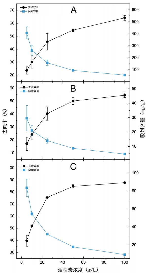 图1:用几种浓度的活性炭处理农用工业沼渣时,计算的COD(A)、PO4-P(B)和总酚(C)参数的吸附容量和去除效率。
