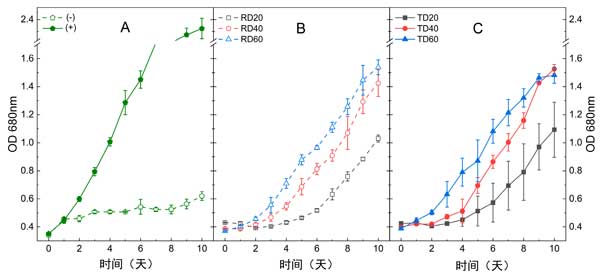 厌氧消化物中存在的大量和微量营养素的多样性可能有利于蓝藻代谢。即使活性炭预处理显着降低了几个参数,包括COD、浊度和苯酚含量,原料(4405mg/L)和预处理消化物(4220mg/L)的铵浓度仍然高于蓝藻螺旋藻支持的阈值浓度(100–150毫克/升)。在这种情况下,使用以三种不同稀释率稀释的原始和预处理消化物进行了一系列蓝藻毒性测定:20×、40×和60×。未稀释的消化物,无论是否用活性炭处理,都没有在本实验中进行测试,因为初步培养分析表明它们对培养物毒性太大(数据未显示)。因此,该实验的目的是比较以不同稀释率稀释的两种消化物以及两个对照组之间的生长性能。连续测量680nm处的OD超过10天,以评估所有条件下的生长情况。在三种不同稀释因子下测试的原始消化物(RD)和处理过的消化物(TD)条件下,观察到类似生长趋势(图2A、B)。当增加原始和预处理消化物的培养基稀释倍数时,会产生更高的生长反应。同样,滞后期受原始消化物和预处理消化物的稀释因子的影响,观察到的滞后期越长,消化物越浓缩。例如,稀释20倍和40倍的未处理消化物的滞后期分别持续4天和2天。在本研究中,根据稀释倍数和预处理条件,使用221和71mg/L之间的初始铵氮(NH4+-N)浓度,钝顶藻能够增殖。一般而言,原始消化物和预处理消化物的更高稀释度产生更高的生长。