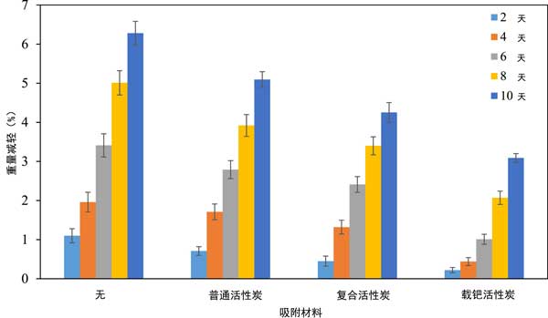 图3:活性炭材料对贮藏2、4、6、8、10天香蕉失重的影响。