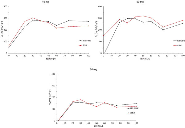 ¡¡¡¡Í¼1£ºÌí¼ÓËáÏ´¼ÁµÄ»îÐÔÌ¿ÓÃÁ¿Îª40¡¢50ºÍ60mgʱµÄÁòËá¸ùÀë×ÓÎü¸½ÄÜÁ¦¡£