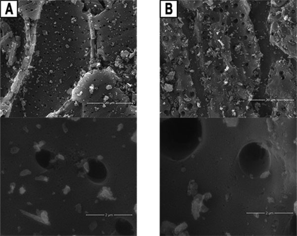 ¡¡¡¡Í¼2£ºSEMÏÔ΢ÕÕÆ¬(A)ËáÏ´»îÐÔÌ¿(B)»îÐÔÌ¿¡£