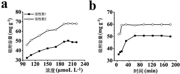 ¡¡¡¡ÎªÁËÆÀ¼Û»îÐÔÌ¿¶ÔCu2+µÄÎü¸½ÄÜÁ¦£¬ÎÒÃÇÑ¡ÔñÁ½ÖÖ»îÐÔÌ¿×÷ΪÎü¸½²ÄÁÏ¡£Îü¸½ÈÝÁ¿¼ÆËã¡£Èçͼ1aËùʾ£¬Îü¸½Æ½ºâËæ×ÅCu2+Ũ¶ÈµÄÔö¼Ó¶øÔö¼Ó¡£Á½ÖÖ»îÐÔÌ¿¾ù±íÏÖ³öÓÅÒìµÄÎü¸½ÄÜÁ¦£¬ÈÝÁ¿·Ö±ðΪ50.21ºÍ68.06mg/g-1¡£Îü¸½Æ½ºâʱ¼äÒ²ÊÇÆÀ¼ÛÎü¸½ÐÔÄܵÄÖØÒªÖ¸±ê£¬Òò´Ë¿¼²ìÁËÎü¸½¶¯Á¦Ñ§¹ý³Ì£¬Èçͼ1bËùʾ¡£»îÐÔÌ¿ÔÚ½Ó´¥60·ÖÖÓºó´ïµ½Æ½ºâ£¬Îü¸½ÈÝÁ¿Îª50.58mg/g-1£¬¶ø»îÐÔÌ¿1ÔÚ½Ó´¥30·ÖÖÓºó´ïµ½Æ½ºâ£¬Îü¸½ÈÝÁ¿Îª59.81mg/g-1¡£