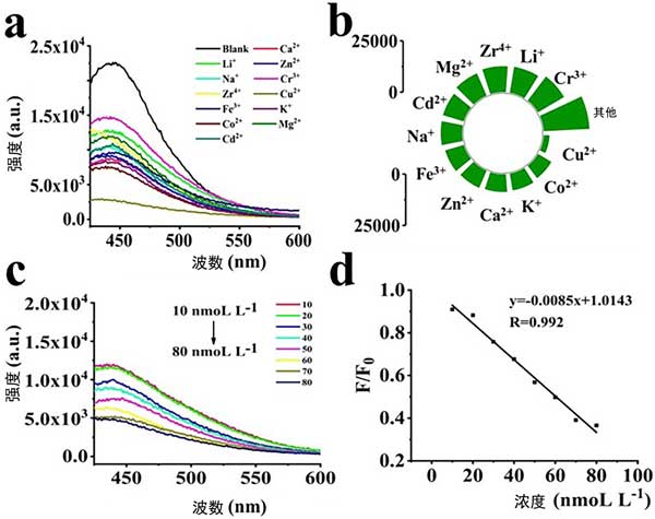 ¡¡¡¡ÄÉÃ×»îÐÔÌ¿µã¶Ô½ðÊôÀë×ÓµÄÑ¡ÔñÐÔÖÁ¹ØÖØÒª£¬Ìí¼ÓÄÉÃ×»îÐÔÌ¿µãºó¼ì²é½ðÊôÀë×ÓµÄÓ«¹âÇ¿¶È¡£µ±½«ÄÉÃ×»îÐÔÌ¿µãÌí¼Óµ½¿Õ°×ÈÜÒººÍº¬ÓÐ12ÖÖ½ðÊôÀë×ÓµÄÈÜÒºÖÐʱ£¬·¢ÉúÓ«¹â·¢É䣬Èçͼ2aºÍbËùʾ¡£È»¶ø£¬µ±Ìí¼ÓCu2+ʱ£¬ÄÉÃ×»îÐÔÌ¿µãµÄÓ«¹âÇ¿¶ÈÃ÷ÏÔϽµ£¬Ó«¹âÇ¿¶ÈϽµÁË87.1%£¬±íÃ÷·¢ÉúÁËÃ÷ÏÔµÄÓ«¹ââ§Ãð¡£Ëæ×ÅCu2+Ũ¶È´Ó10nMÔö¼Óµ½80nM£¬ÄÉÃ×»îÐÔÌ¿µãµÄÓ«¹âÇ¿¶ÈËæ×ÅCu2+Ũ¶ÈµÄÔö¼Ó¶ø½µµÍ£¬Èçͼ2cËùʾ¡£ÏßÐÔÏà¹ØÏµÊý(r)Ϊ0.992(ͼ2d)¡£¼ì²âÏÞ(LOD)¼ÆËãΪ3r/S£¬ÆäÖÐr´ú±í¿Õ°×Ðźűê׼ƫ²î(n=11)£¬nÖ¸¶Ô¿Õ°×ÑùÆ·½øÐÐÖØ¸´²âÁ¿µÄ´ÎÊý£¬S(ָбÂÊ)µÄÏßÐÔÇúÏß)¡£Òò´Ë£¬Cu2+µÄÄÉÃ×»îÐÔÌ¿µãµÄLOD¼ÆËãΪ2.83nmol/L-1¡£Ò»Ð©±¨µÀµÄ²ÄÁÏ¿ÉÒÔͬʱ¼ì²âÁ½ÖÖ»ò¶àÖÖ½ðÊôÀë×Ó¡£ÀýÈ磬²ôÔÓµªºÍÁòÖÆ±¸µÄ»ùÓÚÑòë½Çµ°°×µÄÓ«¹âCQD¿ÉÒÔ¼ì²âCr6+ºÍFe3+¡£Ïà±È֮ϣ¬¸ë·àºÏ³ÉµÄµªÁò¹²²ôÔÓÓ«¹âÄÉÃ×»îÐÔÌ¿µã¿ÉÒÔ¼ì²âHg2+ºÍFe3+¡£ÔÚÎÒÃǵݸÀýÖУ¬ÄÉÃ×»îÐÔÌ¿µã¶ÔCu2+µÄ¼ì²â±íÏÖ³ö¸ßÑ¡ÔñÐÔ¡£ÄÉÃ×»îÐÔÌ¿µãµÄ±íÃæÓлú»ùÍÅ(-COOHºÍ-NH2)¾ßÓкÜÇ¿µÄÑ¡ÔñÐÔÓëCu2+½áºÏµÄÄÜÁ¦£¬µ¼ÖÂÄÉÃ×»îÐÔÌ¿µã¾Û¼¯£¬²úÉú½Ï¸ßµÄâ§ÃðÓ«¹âÇ¿¶È£¬´Ó¶øµ¼ÖÂÄÉÃ×»îÐÔÌ¿µãµÄÓ«¹âÇ¿¶Èâ§Ãð¡£µ±Cu2+Ũ¶ÈÔÚ10ÖÁ80nM·¶Î§ÄÚʱ£¬Ó«¹âÇ¿¶È±íÏÖ³öÁ¼ºÃµÄÏßÐÔÏà¹ØÐÔ£¬Èçͼ2dËùʾ¡£