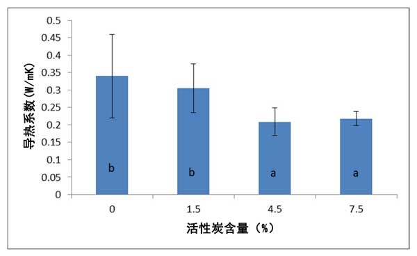 ¡¡¡¡Í¼3£º»îÐÔÌ¿ÔöǿŷËɰåµÄµ¼ÈÈÂÊÖµ¡£Í¼3ÖеÄ×Öĸ(aºÍb)±íʾ¾ßÓÐͬµÈÖØÒªÐÔµÄÑù±¾×é¾Û¼¯ÔÚÒ»Æð¡£