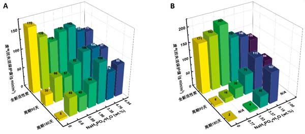 ¡¡¡¡Í¼1£ºÁ×ËáÑÎÌí¼Ó¼Á(NaH2PO4·H2O)Ũ¶È¶Ôеĺͽþ×յĻîÐÔÌ¿µÄ·À»¤ÖµµÄÓ°Ïì¡£(A)¸ÄÐÔ»îÐÔÌ¿£¬(B)»îÐÔÌ¿¡£
