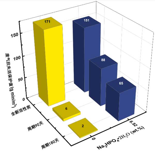 ¡¡¡¡Ê¹ÓÃNa2HPO4·2H2OÌí¼Ó¼ÁµÄʵÑéÔÚ6.52%µÄŨ¶ÈϽøÐУ¬ÆäĦ¶ûµ±Á¿Ï൱ÓÚ5.15%µÄNaH2PO4·H2OŨ¶È¡£Í¼3µÄ½á¹û±íÃ÷£¬Na2HPO4·2H2OÌí¼Ó¼ÁÒ²ÄÜÓÐЧ·Àֹʧ»î£¬µ«²»ÈçNaH2PO4·H2OÓÐЧ¡£ÀýÈ磬ʧ»î180Ììºó£¬·À»¤Öµº¬ÓÐNa2HPO4·2H2OÌí¼Ó¼ÁµÄ»îÐÔ̿Ũ¶ÈϽµÖÁ65mg/min/m3Ïà±È֮ϣ¬Ê¹ÓÃNaH2PO4·H2OÌí¼Ó¼ÁµÄ»îÐÔ̿Ϊ107mg/min/m3¡£