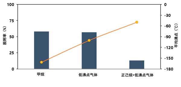 ¡¡¡¡Í¼2£ºµÍ·ÐµãÆøÌåÎü¸½ÊµÑé½á¹û(Îü¸½¼Á5g£¬½øÁÏÆøÌåŨ¶È£º100ppm£¬Îü¸½Á÷Á¿£º100mL/min£¬Îü¸½Î¶ȣº25¡æ)¡£