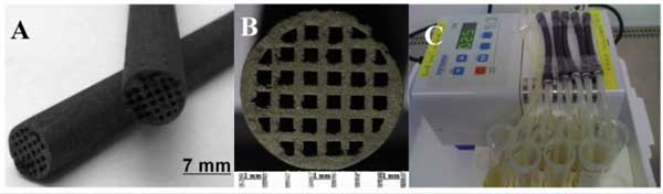 ¡¡¡¡Í¼2£º»îÐÔÌ¿ÕûÌå²ÄÁÏ¡£(A)»îÐÔÌ¿µÄÍâ¹Û³ß´ç£º³¤¶È10ÀåÃ×£¬Ö±¾¶6.9±0.1ºÁÃ×;(B)½ØÃ漸ºÎ³ß´ç£ºÍ¨µÀÊýÁ¿32¸ö£¬±ß³¤0.6ºÁÃ×;±ÚÖ±¾¶0.4ºÁÃ×;(C)ÓÃÓÚ»îÐÔÌ¿ÕûÌå²ÄÁÏLPSÎü¸½Ñо¿µÄÁ÷¶¯Ñ»·ÏµÍ³¡£
