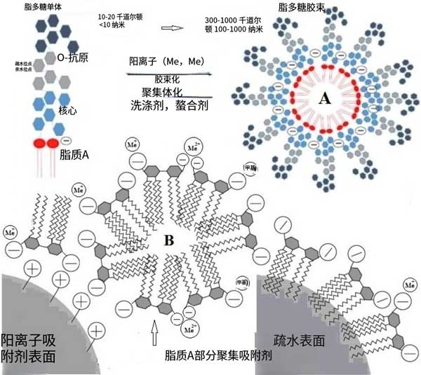 ¡¡¡¡Í¼3:(A)ºÍÔÚË®ÈÜÒº½éÖÊÖÐÓÚÑôÀë×ÓºÍÊèË®ÐÔÉúÎï²ÄÁϱíÃæµÄÎü¸½(B)¡£ºìÉ«±íʾ·Ö×ÓµÄÊèË®²¿·Ö(Ö¬ÖÊ)£¬À¶É«±íʾÀë×ÓÐÔÇ×Ë®²¿·Ö£¬»ÒÉ«±íʾ̼ˮ»¯ºÏÎﲿ·Ö¡£
