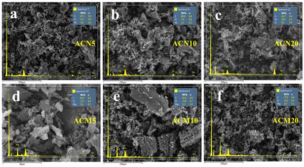 ¡¡¡¡Í¨¹ýɨÃèµç¾µ(SEM)¹Û²ì£¬¸÷Ñù±¾³ÊÏÖËÉÉ¢¡¢¶à¿ÅÁ£½á¹¹¡£¸ÄÐÔºóµÄ»îÐÔÌ¿±íÃæ¿É¼û½ðÊô¿ÅÁ£»ò½ðÊôÑõ»¯Îï¿ÅÁ£·Ö²¼(ÓÈÆäÔÚ¸ºÔØÁ¿½Ï¸ßµÄÑù±¾ÖÐ)£¬ÇÒÓÐÇá΢ÍžÛÏÖÏó¡£ÅäºÏÄÜÆ×(EDS)Ó³Éä¿ÉÒÔÈ·ÈϽðÊô(Mg»òNi)ÔÚ»îÐÔÌ¿±íÃæµÄ·Ö²¼£¬²¢ÑéÖ¤¸ºÔØÊÇ·ñ¾ùÔÈ¡£