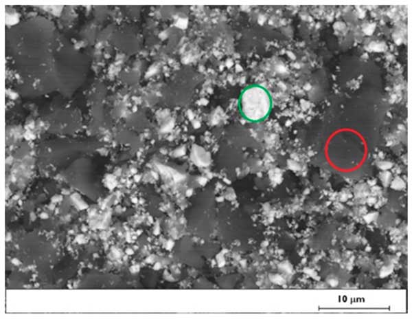 ¡¡¡¡Í¼1£º»îÐÔÌ¿»ìºÏÎï¿ÅÁ£µÄSEMͼÏñ(ÂÌɫԲȦ¶ÔÓ¦ÖØ¾§Ê¯¿ÅÁ££¬ºìɫԲȦ¶ÔÓ¦»îÐÔÌ¿¿ÅÁ£)¡£