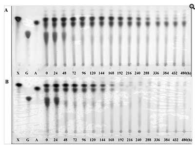 ¡¡¡¡Í¼3¡¢ÊÈÈÈÖ¬·¾Ñ¿æß¸Ë¾úµÄÉÕÆ¿ÅàÑøÈâÌÀµÄTLC·ÖÎö¡£G£¬AºÍX·Ö±ð±íʾÆÏÌÑÌÇ£¬°¢À²®ÌǺÍľÌDZê׼Ʒ¡£
