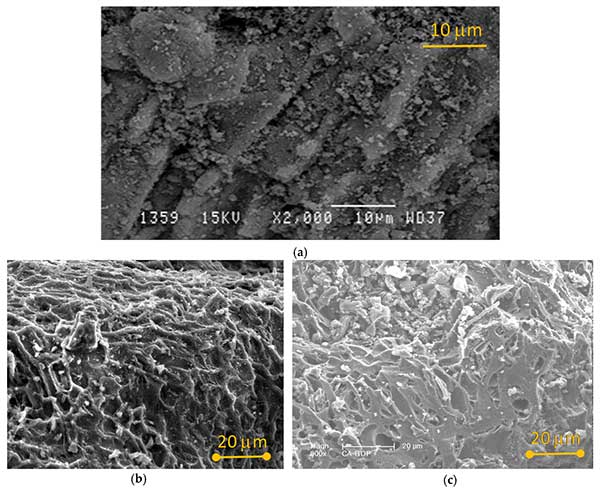 ¡¡¡¡Í¼1.ÑùÆ·µÄɨÃèµç×ÓÏÔ΢ÕÕÆ¬£º(a)»îÐÔÌ¿-H3PO4£¬(b)»îÐÔÌ¿-CO2ºÍ(c)»îÐÔÌ¿-H2O.