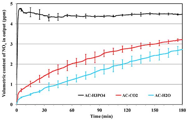 ¡¡¡¡Í¼2ÏÔʾÁËͨ¹ýÈýÖÖ²»Í¬»îÐÔÌ¿µÄ±¡Îü¸½²ãµÄµªÑõ»¯ÎïµÄ´©Í¸ÇúÏß¡£¸ù¾ÝʵÑéʱ¼äÃè»æÁËÔÚÎü¸½¼Á²ãºóÃæ²âÁ¿µÄ×ܺͲÎÊýNOx=NO2+NOµÄÌå»ýº¬Á¿¡£NO2µÄ½ø¿ÚÌå»ýŨ¶ÈʼÖÕ±£³ÖÔÚ5ppm£¬¶ø²»ÌṩNO¡£´©Í¸ÇúÏßÊÇÖØ¸´ÊµÑéµÄƽ¾ùÖµ£¬Îó²îÏß±íʾ±ê׼ƫ²î¡£