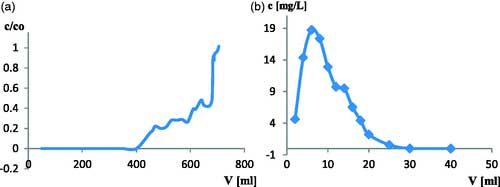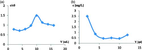 ¡¡¡¡Í¼1(a)»îÐÔÌ¿ÉÏÑÇÏõËá¸ùÀë×ÓÔÚSPE(c/c0=f(V))¹ý³ÌÖеĴ©Í¸ÇúÏß(m car = 0.502g£¬Àë×ÓŨ¶ÈcNO2-=0.135mg/L)¡£Ö¸¶¨Ã¿10mlÂËÒºµÄ±ÈÀýc/c0¡£(b)·ÖÎöͨ¹ýSPEÖùµÄÿ2mlÏ´ÍÑÒººóÀ´×Ô»îÐÔÌ¿µÄÑÇÏõËá¸ùÀë×Ó½âÎüÇúÏß(c=f(V))¡£