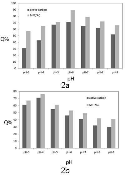 ¡¡¡¡³õʼpHµÄÓ°Ï죺³õʼpH¶Ô¸õºÍпÀë×ÓµÄÈ¥³ýЧÂʵÄÓ°ÏìÔÚpH(3-9)µÄ·¶Î§ÄÚ½øÐÐÑо¿£¬²¢ÔÚ(ͼ2aºÍ2b)Öбíʾ¡£Í¨¹ýÔÚº¬ÓÐ50mL³õʼŨ¶ÈΪ100mg / LµÄ50mLÖØ½ðÊôÈÜÒºµÄÉÕ±ÖУ¬½«0.05g MFT/»îÐÔÌ¿»ò»îÐÔÌ¿½þÅÝÔÚ25¡æÏ£¬²¢ÇÒÒÔ210KHzÉùÇ¿¶È£¬ÒÔ7.7W /ÀåÃ×1Сʱ¡£Èçͼ2Ëùʾ£¬ÓÉÓÚpHÓ°Ïì½ðÊôÀë×ÓºÍMFT¹ÙÄÜÍŵĻ¯Ñ§ÐÔÖÊ£¬MFT / »îÐÔÌ¿´ÓË®ÈÜÒºÖÐÈ¥³ýÖеĽðÊôÀë×ÓÊÇpHÒÀÀµÐÔ¹ý³Ì¡£ÔÚËùÓÐpHÖµ·¶Î§ÄÚ£¬MFT / »îÐÔÌ¿µÄÈ¥³ýϵÊý´óÓÚ»îÐÔÌ¿µÄÈ¥³ýϵÊý¡£¶ÔÓÚ¸õÀë×Ó£¬È¥³ýCr 3+µÄϵÊýÀë×Ó´ÓpH3Ôö¼Óµ½6£¬ÔÚpH6´ïµ½×î´óÖµ¡£ÔÚpH = 6ʱ£¬Ô¼91%µÄ¸õÀë×Ó´ÓÈÜÒºÖÐÈ¥³ý¡£ÔÚpH·¶Î§(7 - 9)£¬È¥³ýϵÊýÂÔÓÐϽµ¡£¶ÔÓÚпÀë×Ó£¬È¥³ýϵÊýÔÚpH4ʱ´ïµ½×î´óÖµ£¬Ð¿Àë×ÓÈ¥³ýÂÊ´ïµ½74%£¬È»ºóÃ÷ÏÔϽµ¡£ÔÚÖÐÐÔ»ò΢ËáÐÔ½éÖÊÖУ¬ÎüÊÕ¿ÉÄÜÊÇÓÉÓÚÊ÷Ö¬ - ½ðÊôÀë×ÓÂçºÏÎïµÄÎȶ¨Ðγɣ¬ÓÉÓÚÅäλôÈËá¸ùÊÍ·ÅH+£¬¿ÉÄܵ¼Ö½éÖÊËá¶ÈÔö¼Ó¡£ÔڽϸߵÄpHֵϣ¬ÖؽðÊôÀë×Ó½«Ë®½â³ÉCr(OH)+ºÍZn(OH)+£¬Òò´Ë£¬ÖؽðÊôÕýµçºÉ¼õÉÙµ½+1£¬ÕâʹµÃÓëòüºÏ¼ÁµÄµÍÏ໥×÷ÓóýÁ˽ðÊôÇâÑõ»¯Îï¿ÉÒÔ³Áµí¡£
