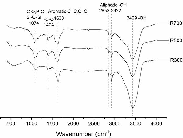 ¡¡¡¡Í¼1.À´×ÔÔÁÏÈȽâµÄ»îÐÔÌ¿µÄ±ä»»ºìÍâ(FTIR)¹âÆ×·ÖÎö¡£