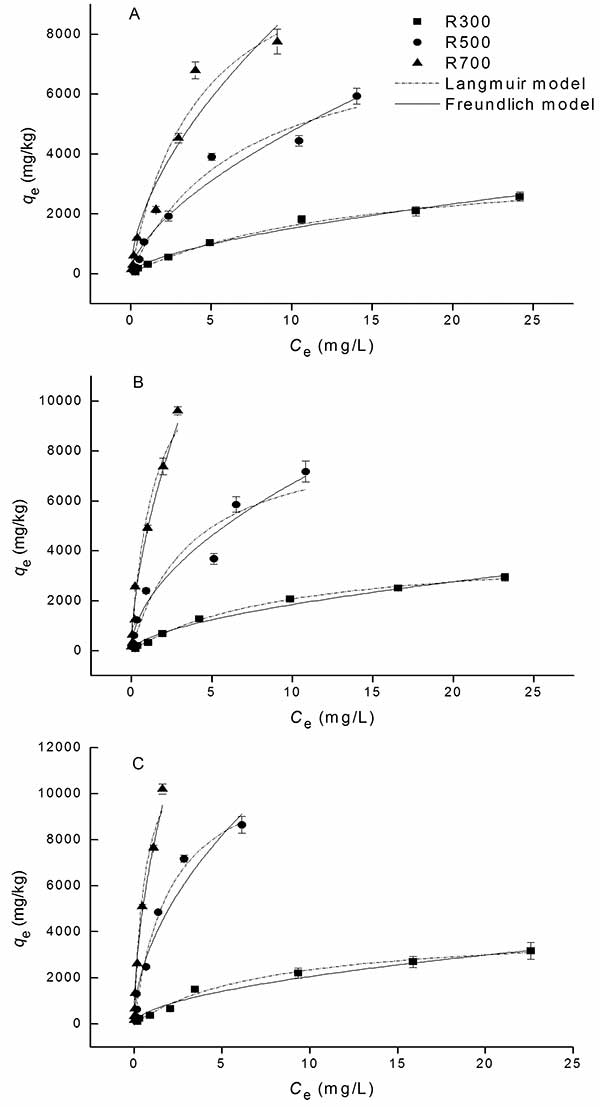 ¡¡¡¡»îÐÔÌ¿ÑùÆ·ÉÏËÄ»·ËصÄÎü¸½µÈÎÂÏßÈçͼ1Ëùʾ¡£Îü¸½Êý¾ÝÏÔʾÓëLangmuirºÍFreundlichÄ£ÐͶ¼ºÜºÃ£¬R 2ϵÊý¸ßÓÚ0.919 ¡£¶ÔÓÚFreundlichÄ£ÐÍÖеIJÎÊý£¬²»Í¬ÑùÆ·µÄnÖµÏà½ü(0.53-0.62)£¬Ð¡ÓÚ1£¬ËµÃ÷Îü¸½ÊÇŨ¶ÈÒÀÀµÐÔ¹ý³Ì¡£·´Ó³ÑùÆ·ÎüÊÕËÄ»·ËØÄÜÁ¦µÄK fµÄÖµÔÚ700¡æÈȽâ²úÉúµÄ»îÐÔÌ¿ÖÐ×î¸ß¡£q max±íʾµÄÇ÷ÊÆLangmuirÄ£ÐÍÖеÄÖµÒ²±íÃ÷Îü¸½ÈÝÁ¿Ëæ×ÅÈȽâζȵÄÔö¼Ó¶øÔö¼Ó¡£¼ÆËã×î´óÎü¸½ÈÝÁ¿ÔÚ´óÔ¼11,834-14,157mg / kgµÄ·¶Î§ÄÚ¡£±íÃæ»ýÊÇÒÑÖªµÄÊÇÓ°Ïì»îÐÔÌ¿µÄÎü¸½ÄÜÁ¦µÄÒ»¸öÖØÒªÒòËØ£¬ÓÈÆäÔÚÈ¥³ýËÄ»·ËصÄÇé¿öÏ¡£ÕâÔÚ±¾Ñо¿Öеõ½Ö¤Êµ£¬»îÐÔÌ¿ÑùÆ·µÄ±íÃæ»ý(S BET)Óëq eÖµÏÔ×ÅÕýÏà¹Ø¡£ÔڽϸߵÄÈȽâζÈÏ£¬»îÐÔÌ¿ÑùÆ·µÄ±íÃæ»ýÔö¼Ó£¬Îü¸½ÄÜÁ¦Ôö¼Ó¡£