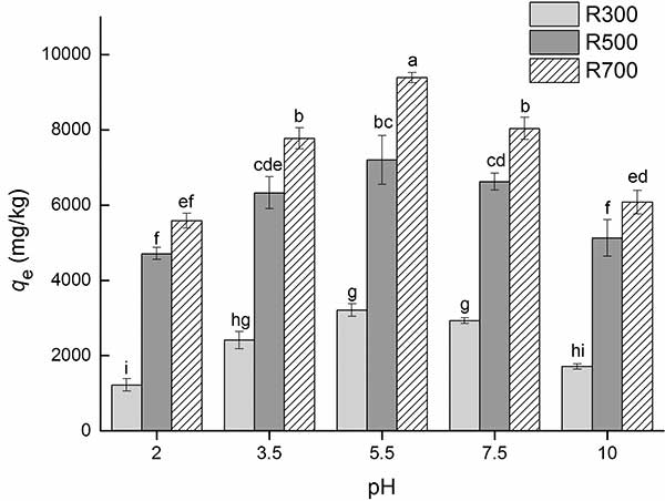 ¡¡¡¡Í¼3. pH¶Ô»îÐÔÌ¿Îü¸½ËÄÂÈ»¯Ì¼µÄÎü¸½ÄÜÁ¦µÄÓ°Ïì¡£ËÄ»·ËØÈÜҺŨ¶ÈΪ32mg / L¡£ÊýÖµÊÇÈýÖØ¾ùÖµ±SD¡£×Öĸ±íʾ´¦ÀíÖ®¼äÔÚp <0.05ˮƽÉϵÄÏÔ×ŲîÒì¡£
