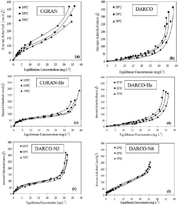 评估原样处理的活性炭对松香酸的吸附情况,结果如图1所示。该图描绘了在处理前和后处理的CGRAN和DARCO活性炭的三种温度(30,50和70℃)下作为平衡浓度函数的吸附容量。从先前对吸附速率的研究(此处未显示),确定在30分钟达到吸附平衡。根据分类等温线,CGRAN和CGRAN-He(图1a和1c)显示了“L”型等温线,这是枞酸和吸附位点之间强亲和力的特征。DARCO(图1b)和DARCO-He(图1d)活性炭表现出“S”型等温线,归因于溶质和溶剂之间竞争吸附的结果,松香酸对吸附位点的亲和力较低。图1e和1f所示的HNO3氧化样品(DARCO-N3和DARCO-N6)的 等温线为“L”型吸附等温线,枞酸和溶剂之间具有强亲和力的特征。26,27另外,DARCO-N3展示了一个被归类为“L2”的等温线,其中平台指示表面上的所有可用位点均分布在单层中,并且DARCO-N6根据“L1”子群显示等温线,其中没有观察到高原,表明未覆盖单层。 这种行为与DARCO-N6显示的更多的表面功能组一致。