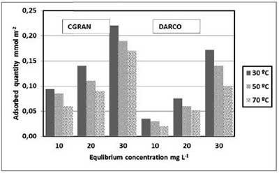 关于活性炭对松香酸的吸附能力,图1a显示CGRAN活性炭的吸附容量随着平衡浓度的增加而增加。相反,图1b显示,DARCO的吸附能力在平衡浓度高达30 mg L -1时稍微增加,然后在所有三个温度下的病房后急剧增加。与DARCO相比,所接收的活性炭的结果显示对CGRAN具有较高的吸附容量,这可归因于较高表面积和较大量的存在于前者的氧官能团的组合。