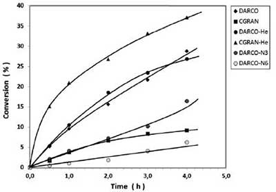 活性炭催化剂的活性在枞酸随时间的变化中进行测试,如图3所示。该图显示DARCO催化剂显示比CGRAN催化剂更高的转化率。图3还比较了接受活化的碳催化剂与He处理的对应物的转化率:CGRAN-He显示出比CGRAN催化剂显着更高的转化率,这是与从TPD,FTIR和酸度结果推断的表面氧基团数目较少有关的行为。DARCO和DARCO-He之间的转化没有明显的差异,这与两种催化剂中表面氧基团的量相似。沿同一线,比较DARCO和相应的硝酸氧化样品的活性,如图3所示。数据清楚地显示了转化率与HNO 3浓度之间的反比关系用于改性处理。因为在处理之后没有明显的变化,所以质地特性的影响可以打折扣; 因此,这种行为显然是酸强度和表面含氧基团的效应,从TPD,FTIR和总酸度结果得出的DARCO活性炭表面的化学修饰的证明。DARCO-N6催化剂的最低转化率可以与它们的最高酸强度相关,而DARCO表现出的最高转化率是由于它们的最低酸强度。这些结果表明,尽管强酸性位点有利于枞酸的吸附,但是它们会削弱催化活性。这些发现也表明这些位点对于催化裂化没有活性。