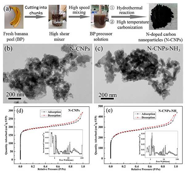 ¡¡¡¡²ÉÓüò±ãµÄ¸ß¼ôÇз½·¨£¬È»ºóͨ¹ýÈÈ»ò°±»î»¯´¦Àí£¬´ÓÐÂÏÊÏ㽶ƤºÏ³É¾ßÓи߱ȱíÃæ»ý(941.2m 2 g -1)µÄ²ôµª»îÐÔÌ¿ÄÉÃ׿ÅÁ£¡£ÕâÖÖ»îÐÔÌ¿ÔÚ¼îÐÔ½éÖÊÖбíÏÖ³öÓÅÒìµÄÑõ»¹Ô·´Ó¦µç»¯Ñ§»îÐÔ¡£´ËÍ⣬ÓÉÓÚÆäÏà¶Ô¸ßµÄßÁऺͻîÐÔÌ¿µªº¬Á¿£¬ÕâÖÖ²ÄÁÏÔÚ¼îÐÔÌåϵÖÐÏÔʾ³öÓÅÒìµÄÄÍÊÜÐÔºÍÎȶ¨ÐÔ£¬ÕâÌṩÁËÑõ»¹Ô·´Ó¦»îÐÔλµã¡£×ÜÖ®£¬ÕâÏîÑо¿ÌṩÁËÒ»ÖÖÐÂÓ±µÄ¸ß¼ôÇз½·¨À´È·¶¨ÐÂÏÊũҵ·ÏÎïµÄ¼ÛÖµ²¢ºÏ³Éµç»¯Ñ§Ñõ»¹Ô·´Ó¦»îÐÔÌ¿´ß»¯¼Á¡£