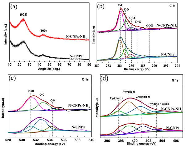 ¡¡¡¡Í¼2.(a)»îÐÔÌ¿ºÍ°±»î»¯µÄ»îÐÔÌ¿ÑùÆ·µÄXRDͼÆ×¡£¸ß·Ö±æÂʵÄXPS¹âÆ×¡£(b)C 1s(c)O 1s ºÍ(d)»îÐÔÌ¿ºÍ°±»î»¯µÄ»îÐÔÌ¿µÄN1s´ø¡£
