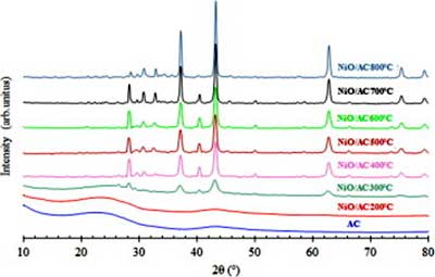 由活性炭和活性炭负载的镍在不同的热处理温度下记录的X射线衍射图如图1 所示。在200中被加热的样品 ℃,在2θ显示有2个衍射峰 = 23.5和43.5°,对应于(0 0 2),(1 0 无定形活性炭0)指数平面。另外,随着煅烧温度从300 ℃ 升高到800 ℃ ,反射次数增加,表明添加的催化剂在2θ = 37.1°,43.2°,62.7°和75.3° 处被氧化成氧化镍 。这些角度分配给(1 1 1),(2 0 0),(2 2 0)和(3 1 1)面,立方晶体的氧化镍。此外,对于400-800 ℃ 煅烧的样品,在对应于(2 2 2)的2θ = 79.3° 处观察到新的峰。氧化镍峰的强度也随着煅烧温度的增加而增加。