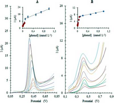 图2、使用DPV方法在的氧化镍活性炭自来水中(A)和橄榄油(B)样品的苯酚校准曲线改性的碳电极在1.0的浓度范围 × 10 -6 mol L−1至1.0 × 10 -3 mol L−1。