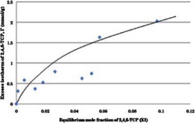 ¡¡¡¡´Ó¹ýÁ¿µÄÎü¸½Êý¾ÝÖУ¬Îü¸½Æ½ºâÇúÏß»æÖÆÔÚyÖáÉϵĹýÁ¿µÈÎÂÏߺÍÔÚxÖáÉÏµÄÆ½ºâĦ¶û·ÖÊýÈçͼ1Ëùʾ¡£Í¼1ÏÔʾ ÁËÔÚÕû¸öŨ¶È·¶Î§ÄÚ£¬ÔÚ30 ¡æµÄºãÎÂÏÂ2,4,6-TCPÔÚ»îÐÔ̼ÉϵĹýÁ¿µÈÎÂÏß¡£´Óͼ1¿ÉÒÔ¿´³ö£¬»ìºÏÎïÖÐûÓз¢Éú¸ºÎü¸½¡£´Óͼ1»¹¿ÉÒԹ۲쵽2,4,6-TCPÔÚ»îÐÔÌ¿ÉϵÄÎü¸½Ëæ×Å2,4,6-TCPŨ¶ÈµÄÔö¼Ó¶øÔö¼Ó¡£